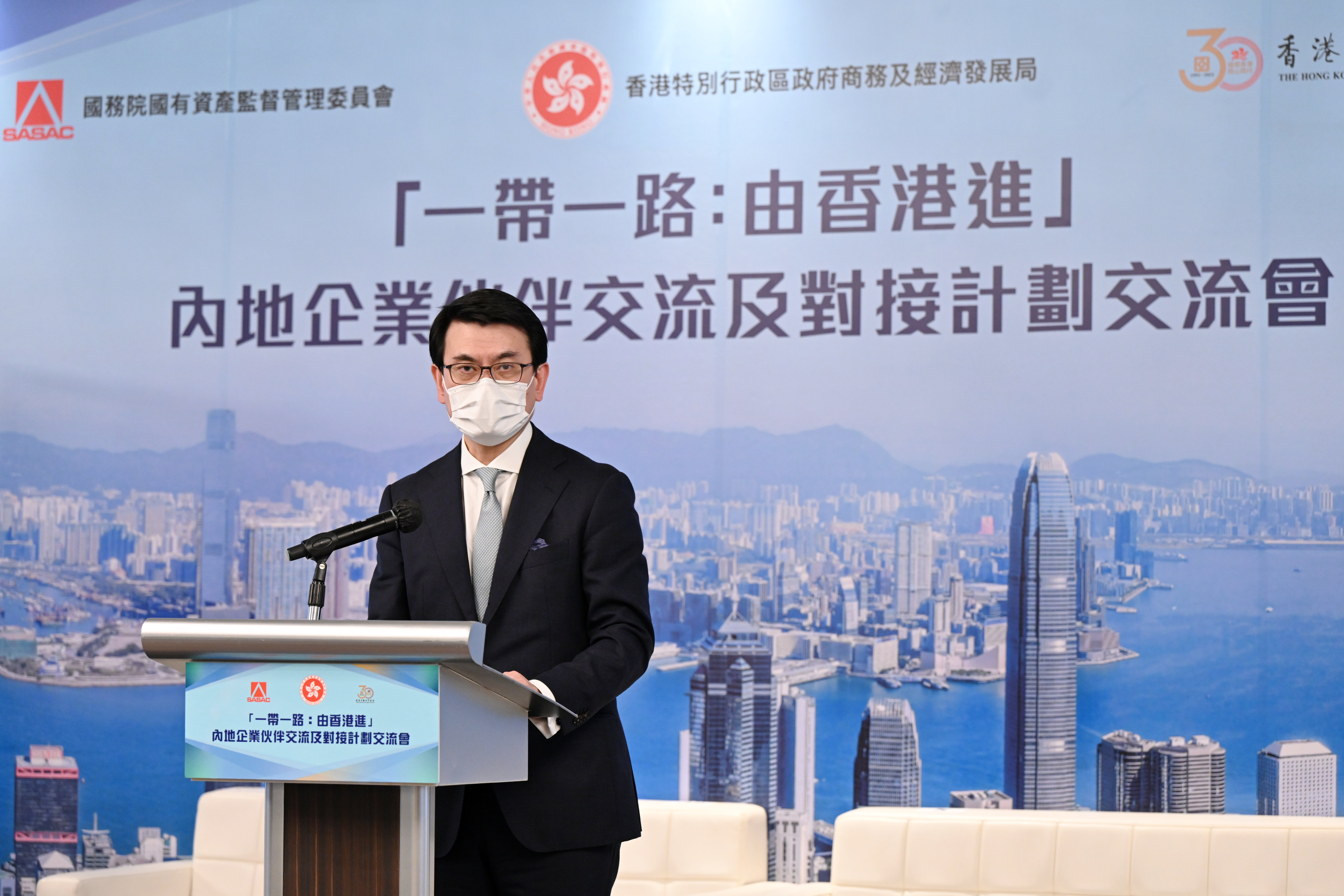 商务及经济发展局(商经局)联同国务院国有资产监督管理委员会(国资委)于2021年5月14日启动「内地企业伙伴交流及对接计划」,并与香港中国企业协会合办计划下的首场交流会,旨在促进内地企业与香港专业服务团体联系,共同把握国家双循环新发展格局下的「一带一路」机遇。